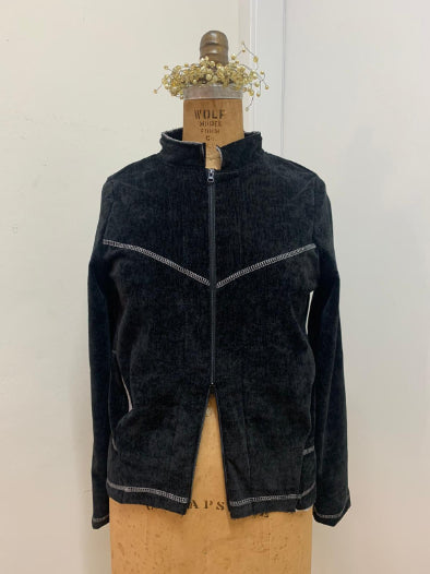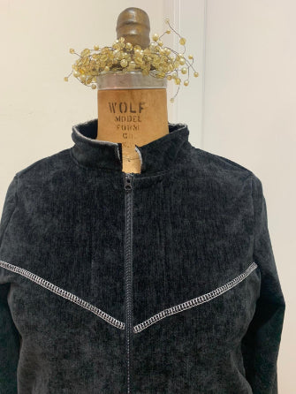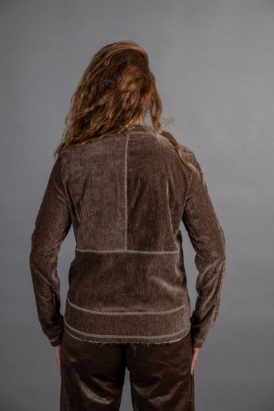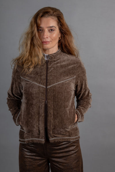 ג'קט מקטיפה גמישה ומפנקת ,חיתוכים מחמיאים ושובבים,מכפלות מעוגלות מהקדמי לגב,השילוב עם התיפורים באפור מרעננים ומדגישים קווי חיתוך