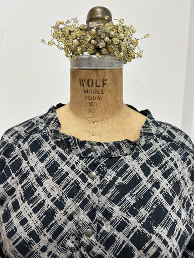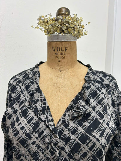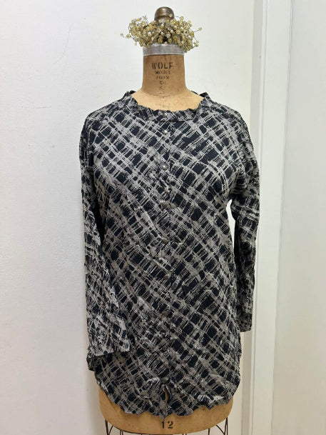 חולצה מכופתרת בקימוט עדין. שרוול שמוט, רכיסת טיקטקים אלגנטית במובן הצעיר של המילה