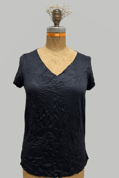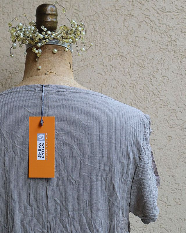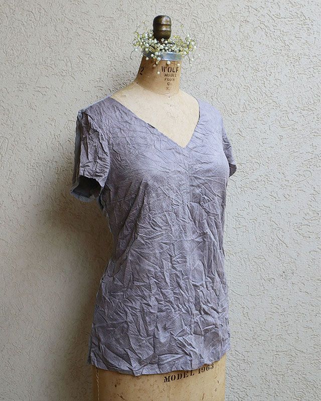 חולצה מפתח V, קידמי דמוי עור גב ריב, טון על טון. עברה תהליך של קימוט עדין. מתאימה עם ג'ינס ליום, ועם מכנס לבוש לערב.
