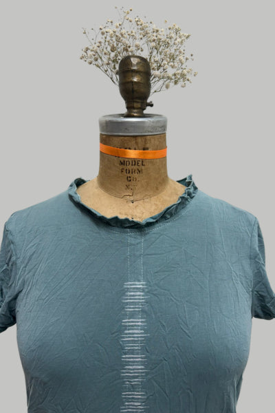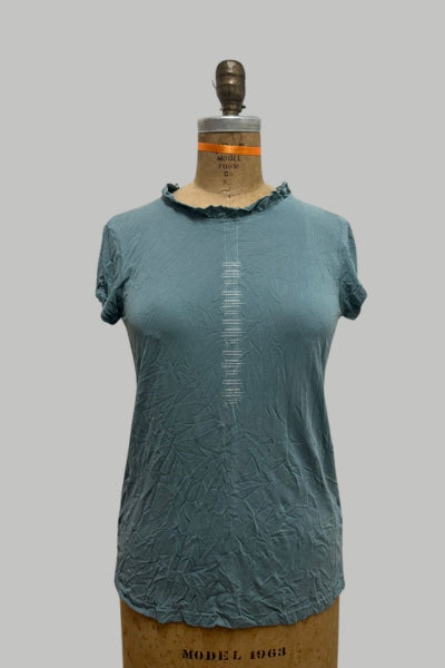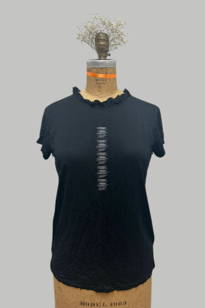 חולצת שרוול קצר צווארון גולף וכיווץ עדים מעוטר בשרוך עור. משובלת בבדים קידמי שחור, גב חום