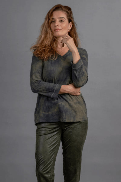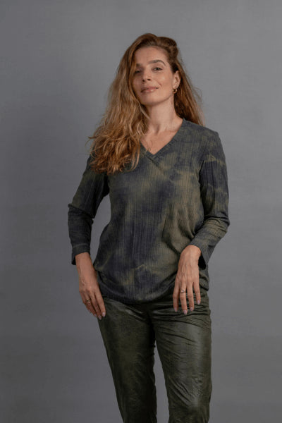 חולצת V מחמיא, שרוול 3/4 בטכניקת שיפשוף וצביעה ייחודית