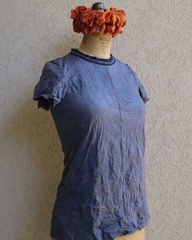 חולצת שרוול קצר, מבד דמוי עור דק, רך ונעים עם קימוט עדין, גולף נמוך. בשילוב 2 צבעים