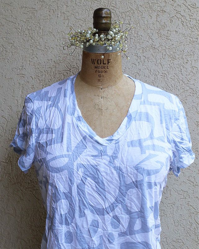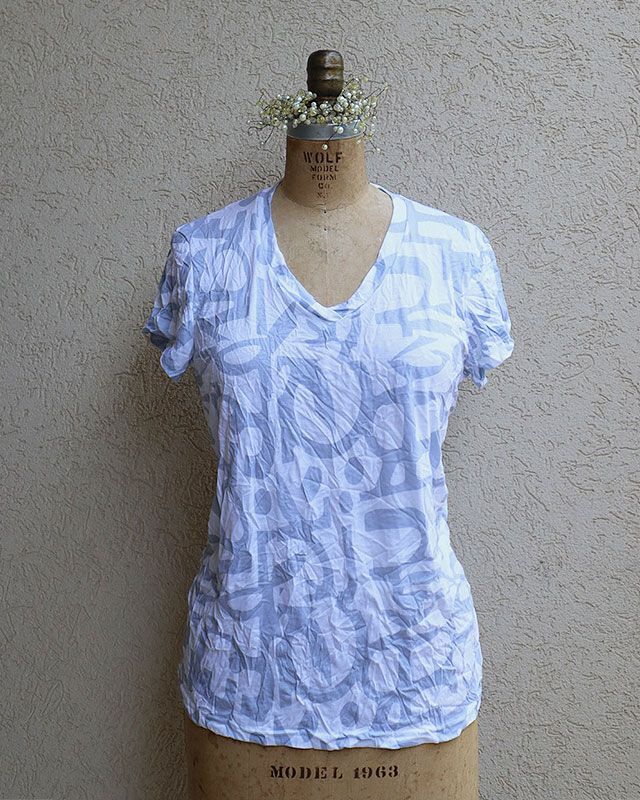 חולצת בייסיק מפתח V , לבנה עם הדפס דיגיטלי ייחוד בצבע אפור על רקע לבן