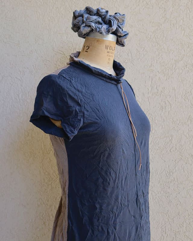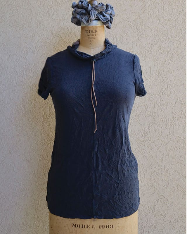 חולצת שרוול קצר צווארון גולף וכיווץ עדים מעוטר בשרוך עור. משובלת בבדים קידמי שחור, גב חום