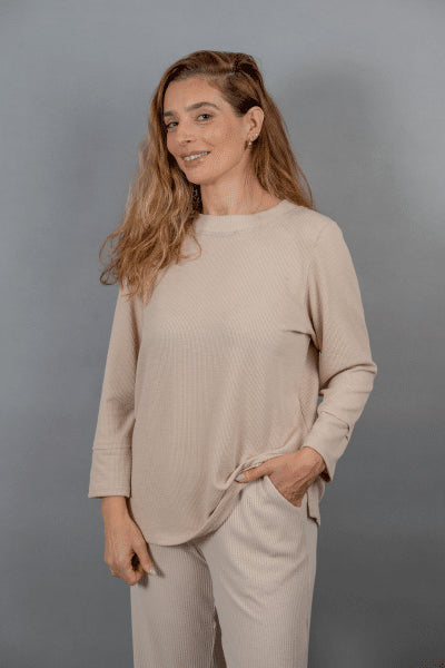 החולצה בגיזרת אובר סייז כייפית במיוחד - שילוב של סריג חלק ושרוולי ריב ארוכים
