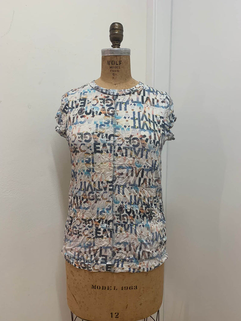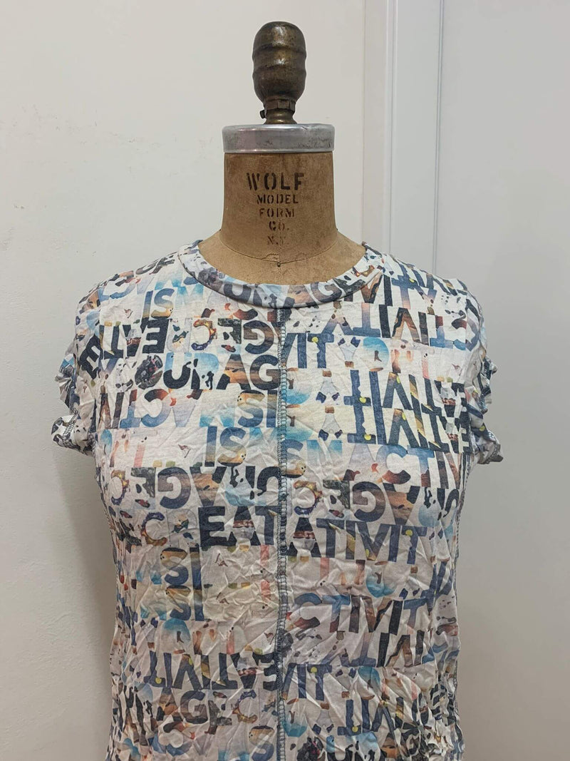 חולצה שרוול שמוט במפתח ניקי חיתוכי פרנסס ואמצע קדמי, הבד כולו דפוס דיגיטלי ייחודי ומאד מקורי, אותיות על רקע לבן