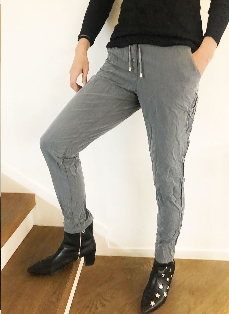 מכנסי גומי צללית צרה בקימוט עדין סופר נוחות ומחמיאות על הגוף. מתאימות עם כל עליונית, סריג או חולצה. רב עונתי