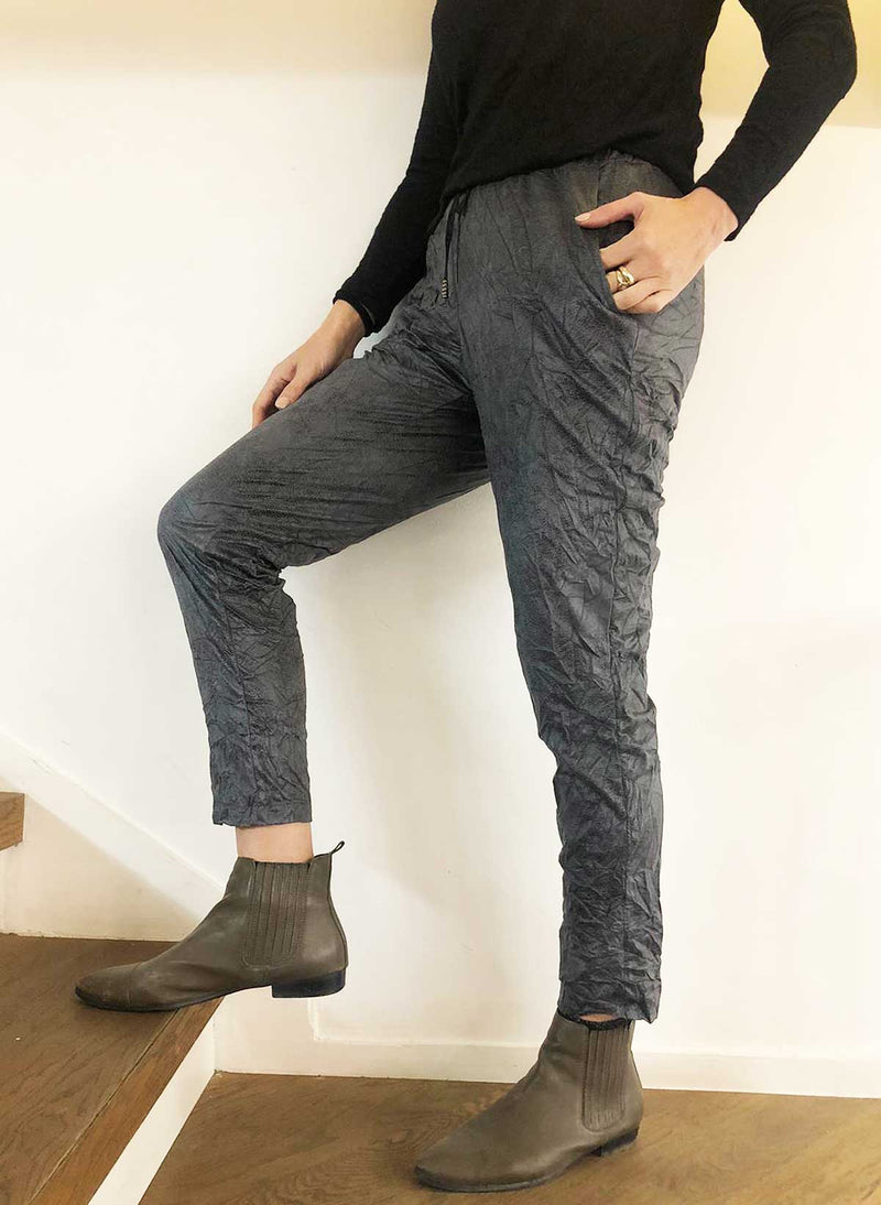 מכנסי גומי צללית צרה בקימוט עדין סופר נוחות ומחמיאות על הגוף. מתאימות עם כל עליונית, סריג או חולצה. רב עונתי