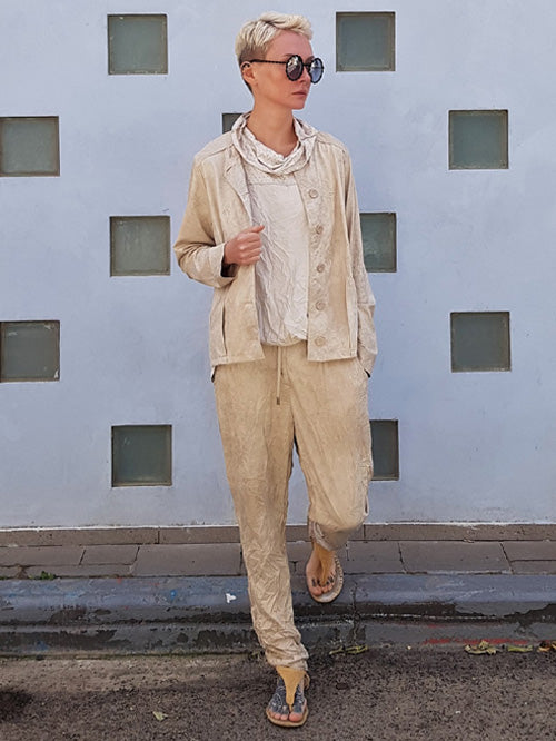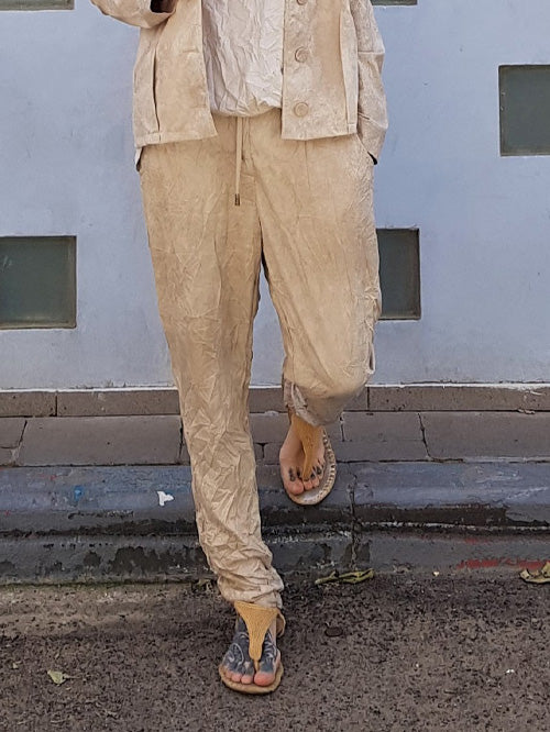 מכנסים דמוי עור עם חגורת גומי נוחה במותן, צללית צרה בקימוט עדין. מכנסיים סופר נוחות ומחמיאות על הגוף.