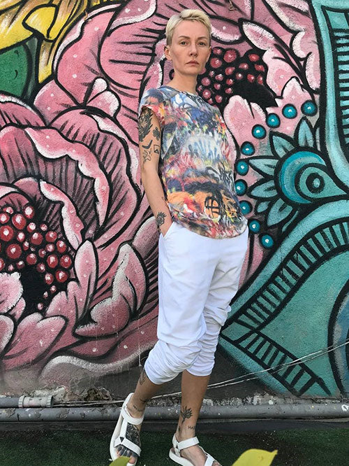 הדוגמנית לובשת חולצת טייסט