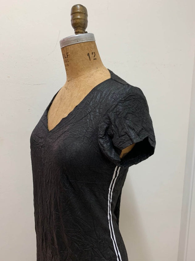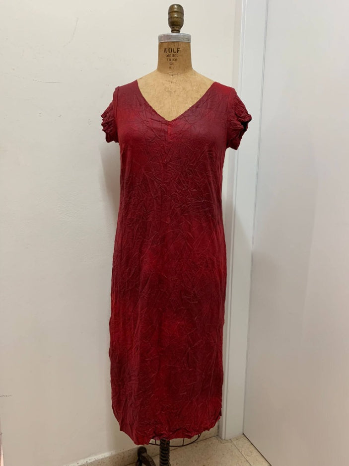 שמלת דמוי עור בקימוט עדין, מפתח וי אורך מתחת לברך, משתלבת נהדרת עם סניקרס או מגף חורפי