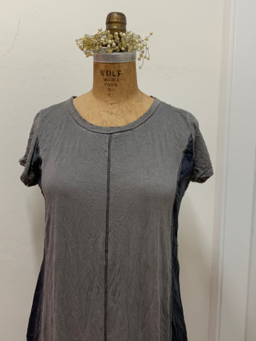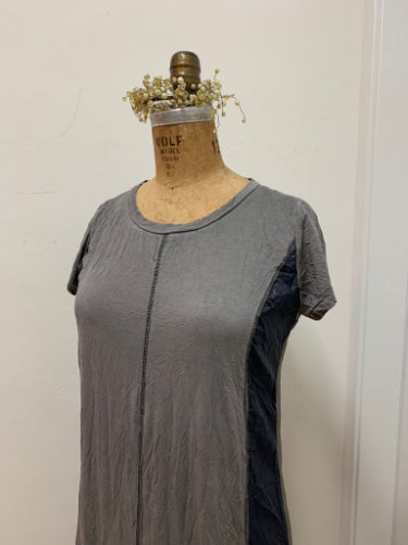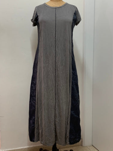 שמלה ארוכה זורמת ונעימה, שילובי בדים, עברה צביעה ייחודית, עם שרוול קצר.